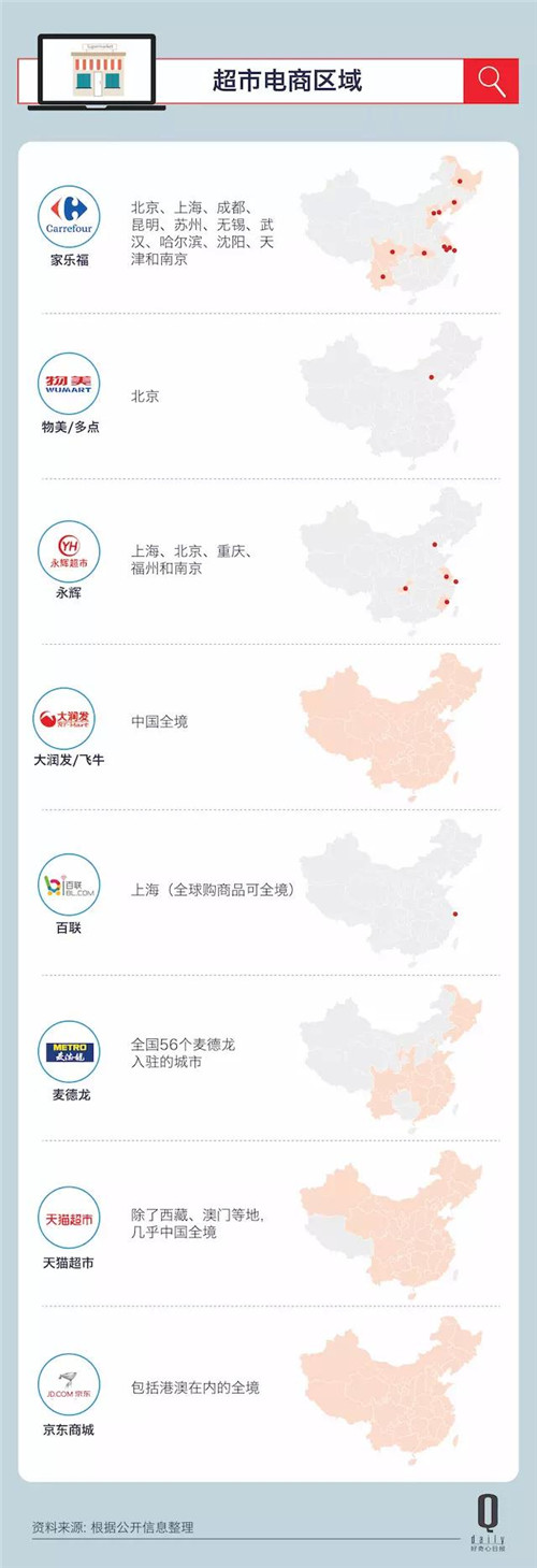 需要說明的是我們排除了排在第二的華潤萬家(6.2%),和第三的沃爾瑪(4.9%),因為前者的“e萬家”幾乎形同虛設(shè),而“網(wǎng)上沃爾瑪”一開始就是 1 號店,而且它現(xiàn)在也已經(jīng)歸屬京東了。而在考慮到主營業(yè)務(wù)本來是企業(yè)客戶的麥德龍的個體消費者業(yè)務(wù)不斷增長的情況下,我們在評測中加入了麥德龍。