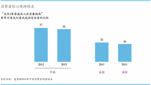2015年調(diào)查數(shù)據(jù)顯示,55%的家庭認為未來五年家庭收入將會顯著提高,而英國和美國在2011年時的數(shù)據(jù)僅為32%和30%。