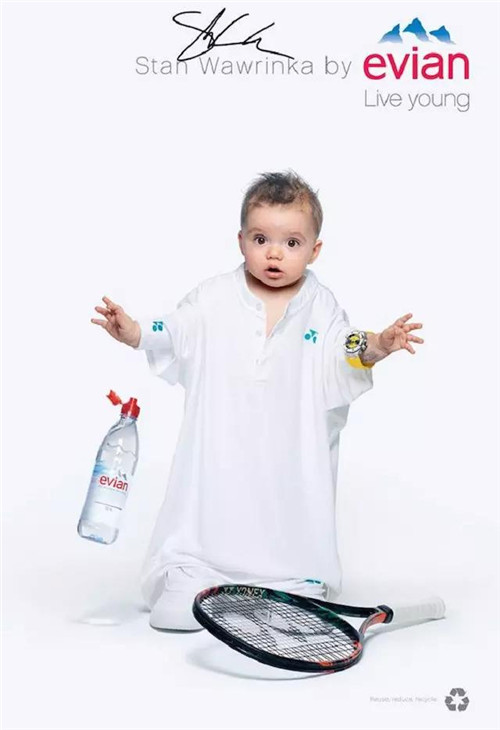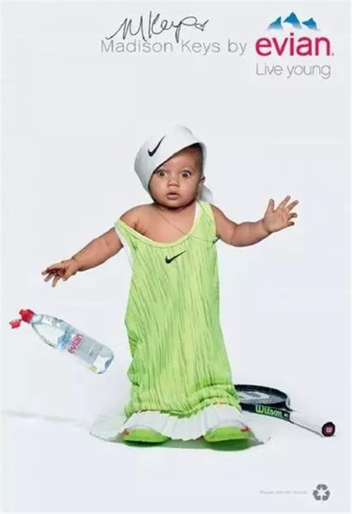 針對戶外、數(shù)字和社交網(wǎng)絡的創(chuàng)意則主要集中在一個 Evian Young Team 的概念,一個由依云代言人莎拉波娃、Stan Wawrinka、Lucas Pouille、Madison Keys 以及高爾夫球員 Lydia Ko 等人組成的團隊來拍攝廣告的主要視覺:喝了依云水之后,他們都換上一套 Oversize 的運動服,“變成了嬰兒”。