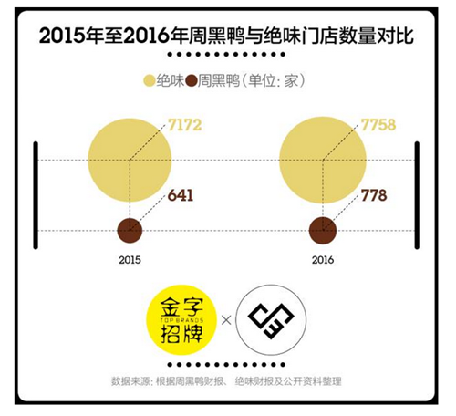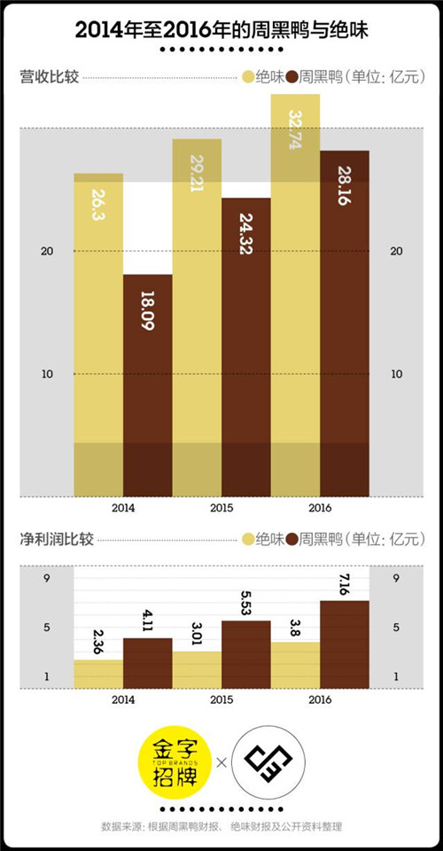 近兩年的市場表現(xiàn)沒有讓潘攀失望。根據咨詢公司弗諾斯特沙利文的數(shù)據,中國休閑鹵制品零售總額從2010年的232億元增長至2016年的637億元,年均復合增長率為18.5%。截至2016年12月31日,周黑鴨全年營收約為28.16億元,較去年同期的24.32億元增長15.8%。雖然778家的門店數(shù)量只有絕味的1/10左右,但周黑鴨的利潤率是絕味的2倍多。