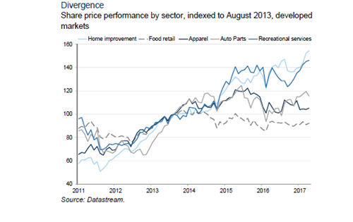 零售商大批破產(chǎn)的同時,一些對電商“免疫”的行業(yè),在過去幾年表現(xiàn)卻明顯優(yōu)于其他消費類行業(yè)。高盛在一篇報告中總結(jié)了以下四類:1、線下體驗型消費(如游樂場);2、“大件”商品和服務(wù)(如家具、教育);3、B2B類商品(如工業(yè)零件);4、有監(jiān)管約束的商品(如藥品)。