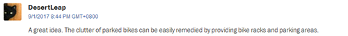網(wǎng)友DesertLeap:“共享單車是好主意。擔(dān)心自行車停放引發(fā)混亂,可以增加自行車架和停車場?!?/font>