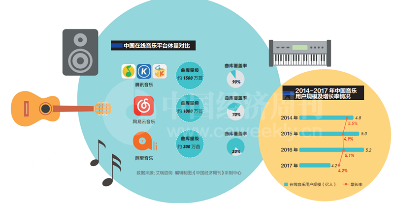 2016年7月,QQ音樂與酷我音樂、酷狗音樂并入騰訊音樂旗下后,騰訊開始對(duì)數(shù)字音樂版權(quán)著重布局。2017年3月和5月,騰訊音樂先后拿下中國(guó)大陸地區(qū)對(duì)環(huán)球音樂所擁有的音樂詞曲獨(dú)代權(quán)和數(shù)字版權(quán)分銷權(quán),并為此付出了3.5億美元現(xiàn)金及購(gòu)買環(huán)球音樂1億美元期權(quán)的代價(jià)。“截至目前,全球范圍內(nèi)有200多家唱片公司持有數(shù)字音樂的版權(quán),目前90%以上都已經(jīng)被騰訊拿下。”一位網(wǎng)易云音樂內(nèi)部人士告訴《中國(guó)經(jīng)濟(jì)周刊》記者,騰訊音樂目前擁有的版權(quán)數(shù)量、廣度和對(duì)版權(quán)的投入都是業(yè)內(nèi)第一,其中不少是“獨(dú)家代理權(quán)”,相當(dāng)于緊緊地扎起了一個(gè)籬笆。