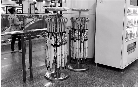 昨天,錢報(bào)記者來到地鐵武林廣場(chǎng)站,在地鐵刷卡入口處附近,就發(fā)現(xiàn)了兩個(gè)圓柱形的架子。架子上掛滿了各式各樣的長(zhǎng)柄雨傘。架子上貼著提示語:掃碼借傘。