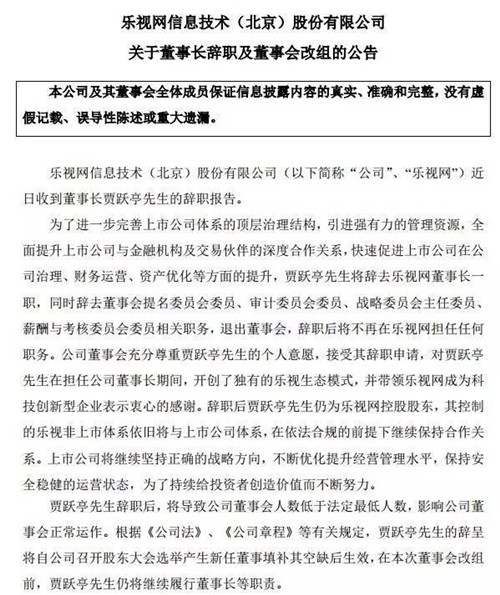 今天賈躍亭老師辭去樂視網(wǎng)董事長一職,同時辭去董事會提名委員會委員、審計委員會委員、戰(zhàn)略委員會主任委員、薪酬與考核委員會委員相關(guān)職務(wù),退出董事會,辭職后將不再在樂視網(wǎng)擔(dān)任任何職務(wù)。
