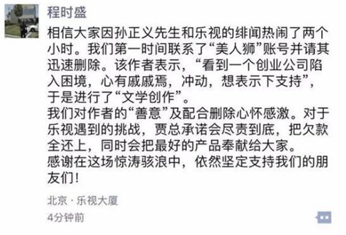 程時盛在朋友圈中寫到:相信大家因?qū)O正義先生和樂視的緋聞熱鬧了兩個小時。我們第一時間聯(lián)系了“美人獅”賬號并請其迅速刪除。該作者表示,“看到一個創(chuàng)業(yè)公司陷入困境,心有戚戚焉,沖動,想表示下支持”,于是進行了“文學(xué)創(chuàng)作”。我們對作者的“善意”及配合刪除心懷感激。對于樂視遇到的挑戰(zhàn),賈總承諾會盡責(zé)到底,把欠款全還上,同時會把最好的產(chǎn)品奉獻(xiàn)給大家。感謝在這場驚濤駭浪中,依然堅定支持我們的朋友們!