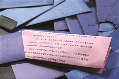 而最棘手則是一些父母與孩子之間有一些矛盾,“我們班一個(gè)男生因?yàn)楦咧袝r(shí)候爸媽管他管得太緊,以至于跟他們之間產(chǎn)生了很大的矛盾,他的父母知道有這樣一個(gè)可以給孩子寫信的機(jī)會(huì)之后,雖然很高興,但是也憂心忡忡,害怕孩子不愿意看他們的信,或者會(huì)因?yàn)檫@封信措辭不合適而加深對(duì)他們的誤解。我開導(dǎo)了他們很久,他們才愿意寫一封信,希望可以解開這個(gè)心結(jié)。”陳老師表示,這位同學(xué)的父母寫的信更像是一封和解信,在字里行間的深深愧疚中,她也感受到了家長(zhǎng)對(duì)于孩子的無奈和那一顆期望孩子快樂的心。
