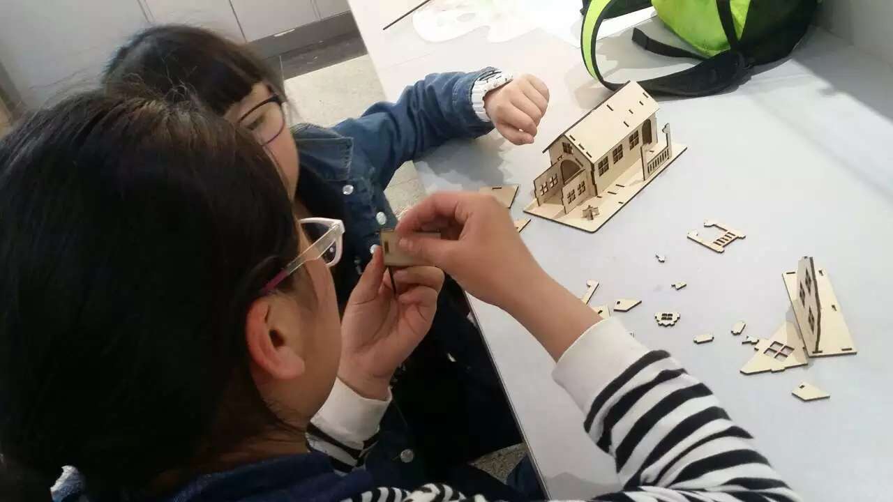 在激光加工區(qū),用激光機(jī)切割而成的大小不一、形狀各異的零件引起了同學(xué)們的興趣。同學(xué)們齊心協(xié)力,將一個個零件拼裝成了房屋模型??粗粭潡潉e墅呈現(xiàn)在眼前,孩子們歡呼雀躍,體驗著動手動腦的樂趣,感受著成功的喜悅。