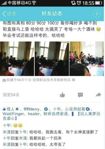 4月12日,報(bào)道了安順職業(yè)技術(shù)學(xué)院一名教師與學(xué)生在辦公室飲酒,并聲稱以喝酒多少來定考試成績(jī)之后,引起了該學(xué)院高度重視。據(jù)了解,目前,涉事教師已停職接受調(diào)查。