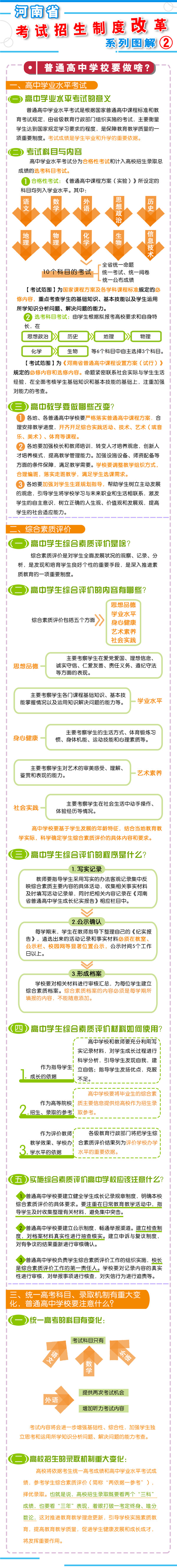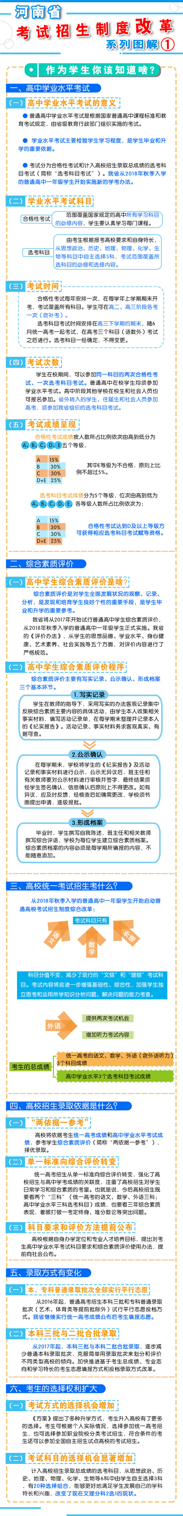 四、改革監(jiān)督管理機(jī)制 加強(qiáng)信息公開(kāi),全面實(shí)施高校招生“陽(yáng)光工程”,進(jìn)一步擴(kuò)大信息公開(kāi)的范圍和內(nèi)容。強(qiáng)化考試安全,堅(jiān)持從嚴(yán)治考,完善考試招生誠(chéng)信制度,落實(shí)誠(chéng)信結(jié)果使用要求。加大違規(guī)查處力度,加強(qiáng)考試招生全程監(jiān)管,嚴(yán)厲打擊和嚴(yán)肅查處考試招生中的違法違規(guī)行為,及時(shí)公布查處結(jié)果,嚴(yán)格責(zé)任追究?! ?strong>五、2018年秋季開(kāi)始實(shí)施 從2018年秋季入學(xué)的普通高中一年級(jí)學(xué)生開(kāi)始啟動(dòng)普通高??荚囌猩贫染C合改革。 在改革考試科目設(shè)置上,不分文理科,外語(yǔ)科目提供兩次考試機(jī)會(huì)??忌目偝煽?jī)由統(tǒng)一高考的語(yǔ)文、數(shù)學(xué)、外語(yǔ)(含外語(yǔ)聽(tīng)力)3個(gè)科目成績(jī)和高中學(xué)業(yè)水平3個(gè)選考科目考試成績(jī)組成。保持統(tǒng)一高考的語(yǔ)文、數(shù)學(xué)、外語(yǔ)分值不變?! ≡诟母镎猩浫C(jī)制上,推進(jìn)基于統(tǒng)一高考成績(jī)和高中學(xué)業(yè)水平考試成績(jī)、參考學(xué)生綜合素質(zhì)評(píng)價(jià)的多元錄取機(jī)制改革。高校要根據(jù)自身辦學(xué)定位和專業(yè)人才培養(yǎng)目標(biāo),提出對(duì)考生高中學(xué)業(yè)水平考試科目要求和綜合素質(zhì)評(píng)價(jià)使用辦法,提前向社會(huì)公布?! ?016年省教育行政部門出臺(tái)普通高中學(xué)業(yè)水平考試實(shí)施辦法和普通高中學(xué)生綜合素質(zhì)評(píng)價(jià)實(shí)施辦法,從2018年秋季入學(xué)的普通高中一年級(jí)學(xué)生開(kāi)始正式實(shí)施。