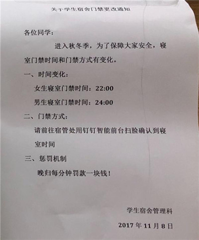 近日,有杭州某高校學生爆料,杭州某大學宿舍管理處為管理學生寢室門禁,引入人臉識別簽到,要求女生在晚上10點前回宿舍,晚到一分鐘罰款1塊錢,而男生竟然可以晚兩小時。