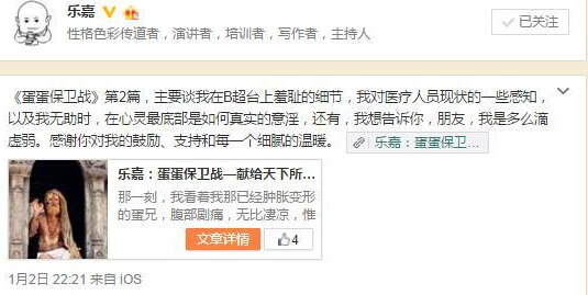 樂嘉在文中不僅敘述了傷后2次就醫(yī)照B超的過程,以及對醫(yī)療人員現狀的一些感知,還在文中自我安慰稱“我開始想我的丫頭靈兒,嗯,還好,樂門有后啦;我開始想40歲時幸好做了精子冷凍”。