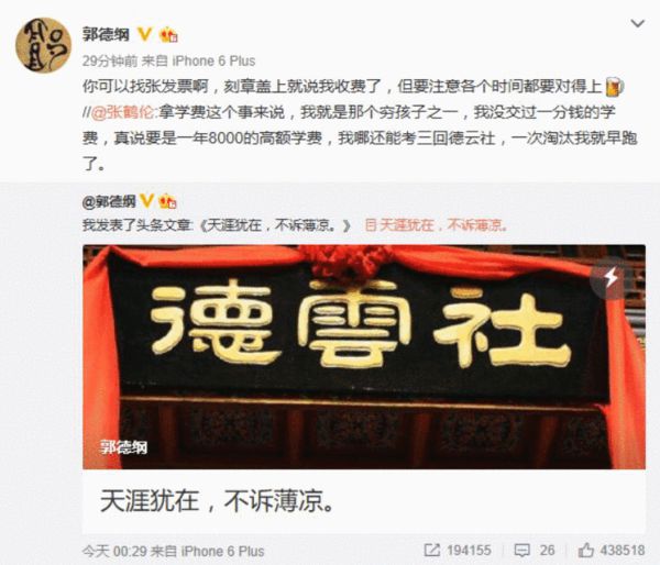 近日,曹云金與師父郭德綱陷入罵戰(zhàn),早前曹云金開炮后,郭德綱在25日凌晨終于發(fā)表長文反擊,稱就在今天(9月25日)下午,曹云金再次做出了回應,并曬出發(fā)票證明郭德綱曾收過學費。郭德綱隨后再度回擊曹云金:“你可以找張發(fā)票啊,刻章蓋上就說我收費了,但要注意各個時間都要對得上?!币芍覆茉平鹌睋?jù)有假。