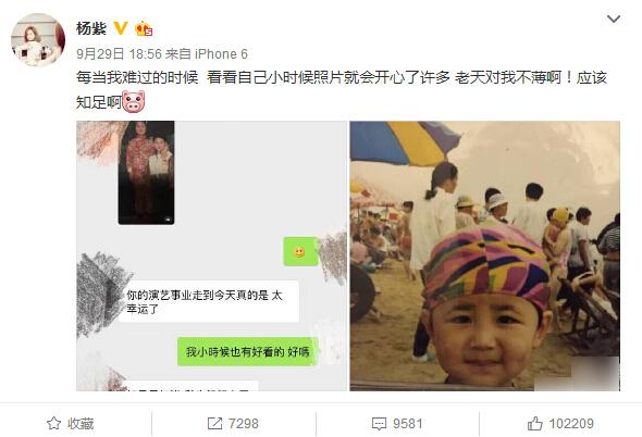 9月29日,楊紫曬出兩張照片,一張為聊天的截圖,一張為楊紫小時(shí)候的照片,楊紫寫道:“每當(dāng)我難過的時(shí)候,看看自己小時(shí)候照片就會(huì)開心了許多。老天對(duì)我不薄??!應(yīng)該知足啊。”