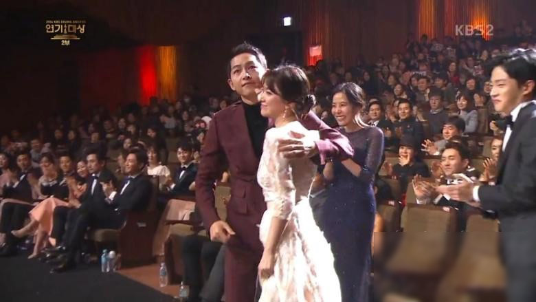 2016年KBS演技大賞最重要大獎由《太陽的后裔》宋仲基和宋慧喬獲得,兩人一上臺皆難掩激動情緒,忍不住哽咽。宋慧喬對于獲得“最佳CP獎”發(fā)表感言,“和喜歡的人一起領獎,真的很開心”,在主持人全炫茂的詢問之下,滔滔不絕地稱贊宋仲基就和劇中的劉時鎮(zhèn)一樣,“幽默、聰明、真誠又溫柔”,宋仲基則回贊對方,“真的非常美麗又大方”,他們更現(xiàn)場重現(xiàn)了“什么血型”的撒嬌,彼此溺愛的眼神超吸睛。