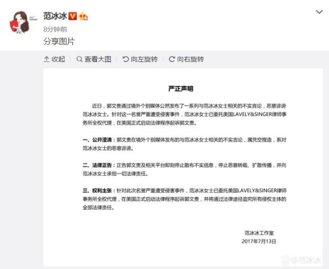 7月13日,范冰冰工作室針對郭文貴此前發(fā)布的與范冰冰有關(guān)的言論,做出“嚴(yán)正聲明”,并宣布將在美國啟動訴訟程序起訴郭文貴。