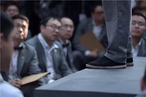 馬校長遲到了10多分鐘,隨后脫掉了上午穿的西裝外套、皮鞋,身著紅色毛衣、黑布鞋登臺。