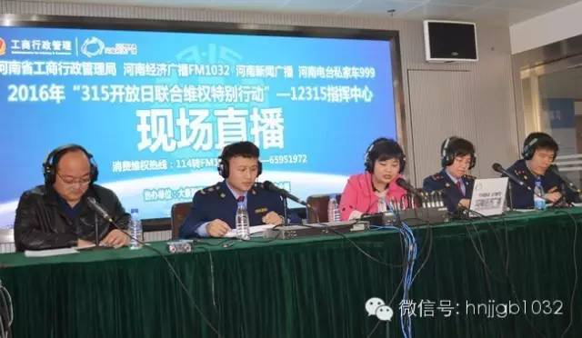 河南經(jīng)濟(jì)廣播在河南省工商局12315消費(fèi)者投訴舉報中心搭建直播室,河南經(jīng)濟(jì)廣播主持人依明和省工商局12315中心主任宋環(huán)英(右二)、省工商局12315消費(fèi)維權(quán)先鋒隊隊長鄭巖(左二)、省工商局企業(yè)信用信息監(jiān)管處副處長萬柳(右一)、河南經(jīng)濟(jì)廣播特約評論員李剛(左一)在直播現(xiàn)場。