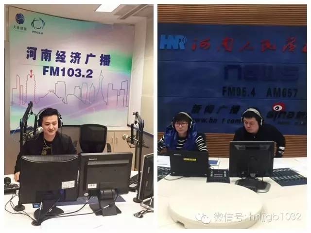 本部直播室中,河南經(jīng)濟(jì)廣播主持人蘇鵬(左一)和河南新聞廣播主持人趙蕾(右二)、私家車999主持人莫非(右一)正在并機(jī)直播。