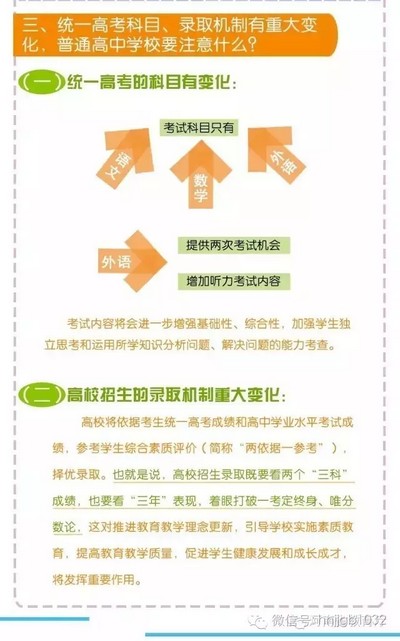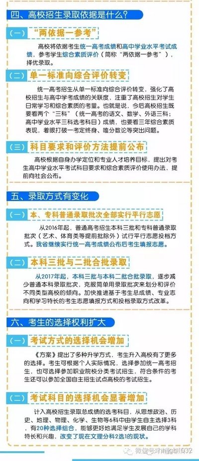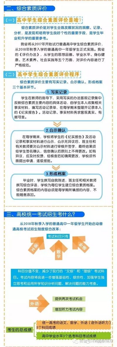按照《方案》要求,我省從2018年秋季入學的普通高中一年級學生開始啟動高考綜合改革,考生總成績由統一高考的語、數、外3科成績和高中學業(yè)水平3個選考科目成績組成。招生錄取實行基于統一高考成績和高中學業(yè)水平考試成績、參考學生綜合素質評價擇優(yōu)錄取機制。