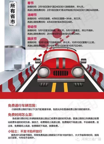 2015年春節(jié)放假安排時(shí)間表已經(jīng)出爐,春節(jié)高速公路免費(fèi)時(shí)間具體從哪天開始?持續(xù)多長(zhǎng)時(shí)間?哪些車型可以免費(fèi)通行?
