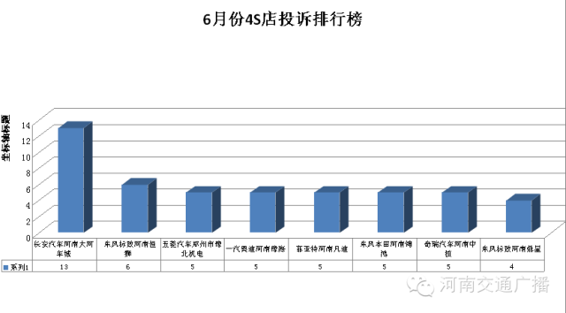應廣大聽眾要求,本次排行榜首次公布了汽車4S店投訴排行,分別是:長安汽車河南大河車城、東風標致河南恒獅4S店、五菱汽車鄭州市豫北機電、一汽奧迪河南豫海4S店、菲亞特河南凡迪4S店、東風本田河南錦鴻4S店、奇瑞汽車河南中值4S店、東風標致河南鼎星4S店。