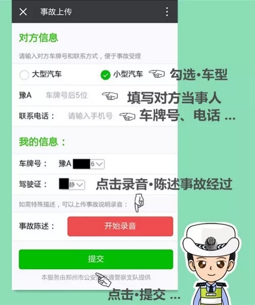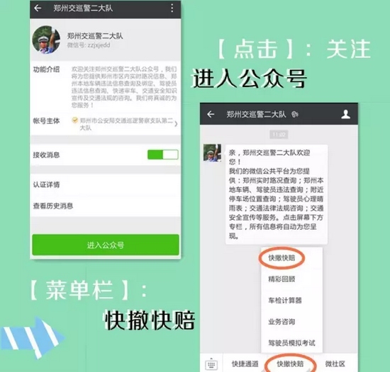 支隊(duì)科研所此次研發(fā)的交通事故快賠快撤功能,跳出了以往單方損失2000元以下的限制,只要在交警二大隊(duì)轄區(qū):嵩山路(含)嵩山路以西區(qū)域及中原區(qū)、西開發(fā)區(qū)全境,公共道路上發(fā)生的兩車事故,車輛能夠正常駕駛,沒有人員受傷,就可以通過“鄭州交巡警二大隊(duì)微信公共平臺(tái)”進(jìn)行快撤快賠處理。