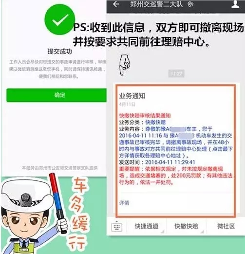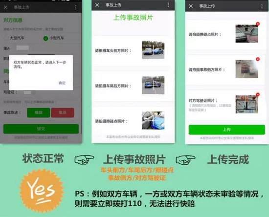 該功能上線后,親們,再也不用站路邊“說個(gè)舌尖帶火,嗓子冒煙”了,只需拍幾張現(xiàn)場(chǎng),照片發(fā)個(gè)微信就可以馬上閃人、撤離事故現(xiàn)場(chǎng)!既不造成交通擁堵又安全省力。