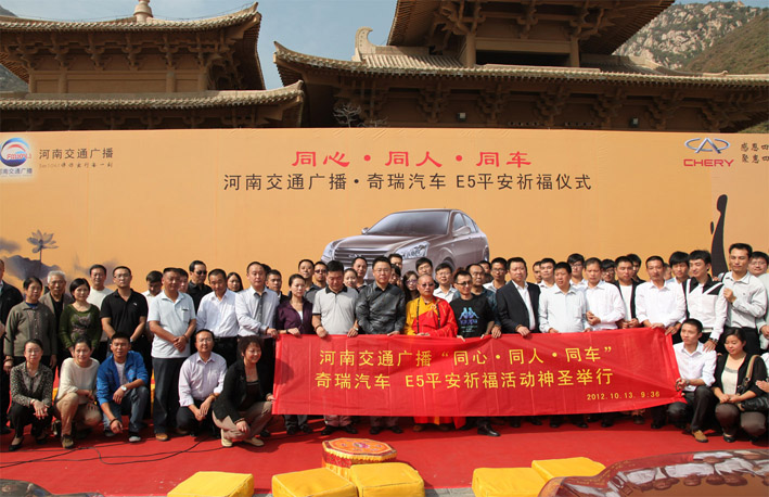 公元2012年10月13日(農(nóng)歷八月二十八)9:36正點(diǎn)時(shí)刻,河南交通廣播“同心?同人?同車—奇瑞汽車 E5平安”祈?;顒?dòng)神圣舉行。河南交通廣播為了讓本次祈?;顒?dòng)氣氛更好,在更大范圍內(nèi)傳播、弘揚(yáng)禪宗之精神。特把本次活動(dòng)的主要儀式設(shè)置禪文化氛圍濃郁的“禪宗少林·音樂大典”內(nèi)神圣舉行。