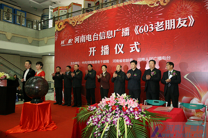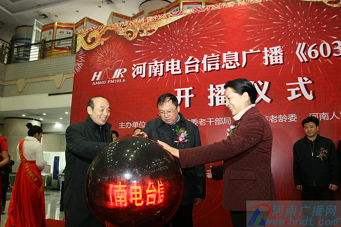 上午9點(diǎn),開(kāi)播儀式在河南廣播大廈舉行,中共河南省委老干部局局長(zhǎng)汪曉微,中共河南省委宣傳部副部長(zhǎng)、省廣電局局長(zhǎng)趙景春,省老齡委副書(shū)記、省民政廳副廳長(zhǎng)常東河共同啟動(dòng)LED球,宣布《603老朋友》節(jié)目正式開(kāi)播。省委老干部局副局長(zhǎng)李修建、副局長(zhǎng)王金貴、省廣電局副局長(zhǎng)薛德星、省廣電局副局長(zhǎng)王仁海、河南人民廣播電臺(tái)臺(tái)長(zhǎng)李新全、河南人民廣播電臺(tái)總編輯張大寶等領(lǐng)導(dǎo)也出席了開(kāi)播儀式。