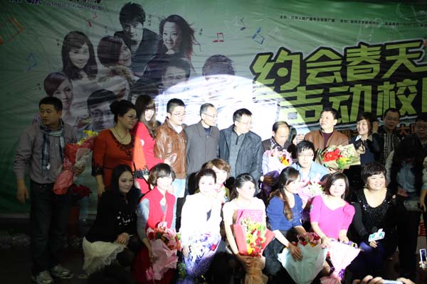 在兩個(gè)小時(shí)的活動(dòng)時(shí)間里,河南電臺(tái)信息廣播《真情故事》節(jié)目主持人楊城、佳音,《文聰時(shí)間》節(jié)目主持人文聰,《有愛向前沖》節(jié)目主持人丁丁、《今夜情歸航》節(jié)目主持人牧歌等人紛紛登臺(tái),以歌曲、小品等形式展示主持人的個(gè)性與風(fēng)采,并與學(xué)生互動(dòng)游戲,以此來回報(bào)聽眾多年來的堅(jiān)守與厚愛。他們帶來的小品《相親》、《超幸福鞋墊兒》、真情故事《你能背我上樓嗎》及《有愛向前沖》和《文聰時(shí)間》節(jié)目,邀請(qǐng)場(chǎng)下的學(xué)生現(xiàn)場(chǎng)互動(dòng),使整個(gè)活動(dòng)高潮迭起,精彩紛呈。在演出期間,信息廣播還為楊雪、張一迪、王衛(wèi)衛(wèi)等10名大學(xué)生頒發(fā)了聘書,聘請(qǐng)他們擔(dān)任聽評(píng)員。曾經(jīng)榮獲央視“原創(chuàng)中國”歌壇十大新人稱號(hào)的我省著名本土男歌手余潤澤,也來到了活動(dòng)現(xiàn)場(chǎng),他的一曲《愛我就不要離開我》引爆了全場(chǎng),為見面會(huì)演出圓滿收尾。