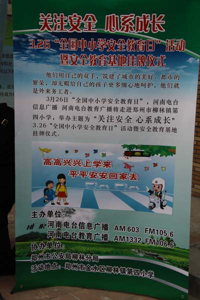 2012年3月26日是第十七個(gè)“全國中小學(xué)安全教育日”,在教育日當(dāng)天舉行“中小學(xué)安全教育基地”掛牌儀式,河南電臺信息廣播依托日常欄目《法制新河南》的整合資源,將中小學(xué)安全宣傳教育常態(tài)化。據(jù)河南電臺信息廣播總監(jiān)李金鋒介紹,“教育基地建立以后,河南電臺信息廣播將聯(lián)合鄭州市公安局柳林分局,通過信息廣播AM603、FM105.6廣播頻率,以《法制新河南》欄目為陣地,長期持久的宣傳中小學(xué)安全教育知識,并為柳林鎮(zhèn)第四小學(xué)的學(xué)生提供書籍、器械等安全教育的物品,節(jié)目主持人和柳林分局的警官還將不定期的深入校園內(nèi),跟學(xué)生們面對面的交流、一對一的輔導(dǎo)?!?br />