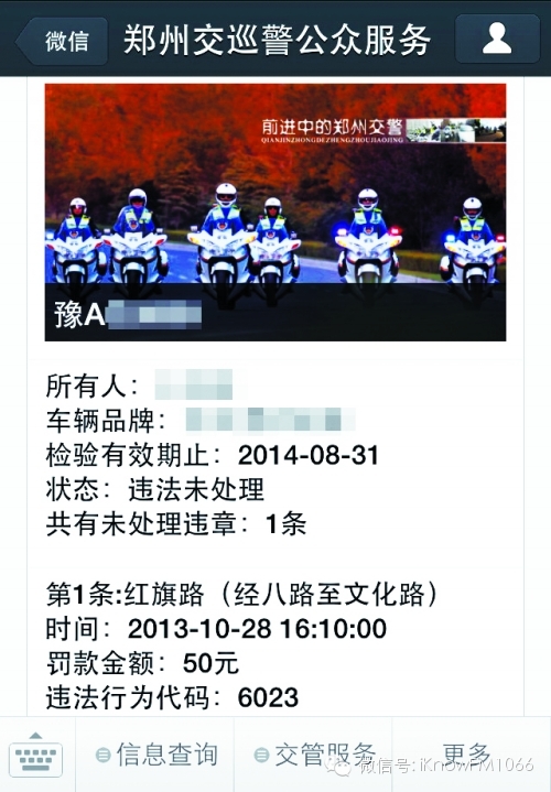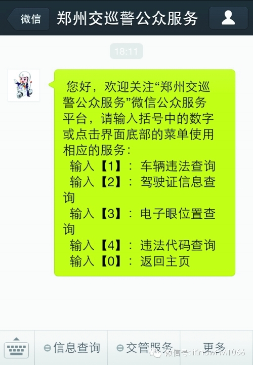 鄭州交巡警微信手機(jī)客戶端“鄭州交巡警公眾服務(wù)”昨天開始試運(yùn)行。打開手機(jī)微信,搜索微信號(hào)“zzjjzd”,您就可以關(guān)注“鄭州交巡警公眾服務(wù)”。只需輸入數(shù)字代碼,就能進(jìn)行查詢車輛違法信息、道路臨時(shí)管控信息、電子眼分布位置信息等。