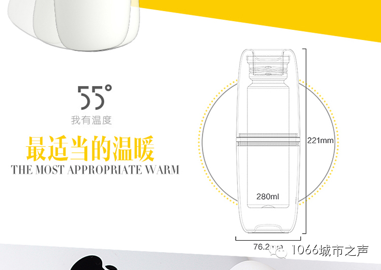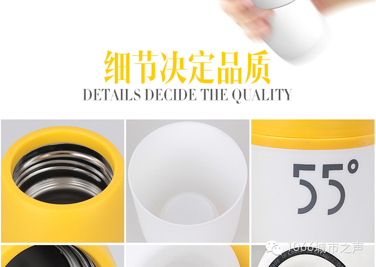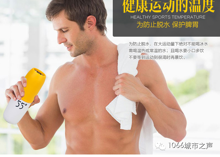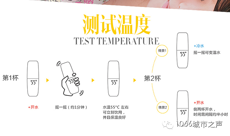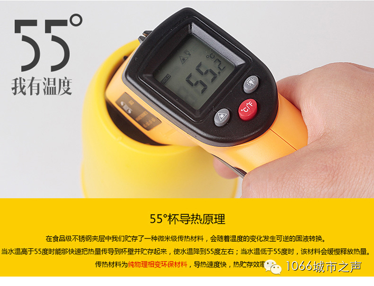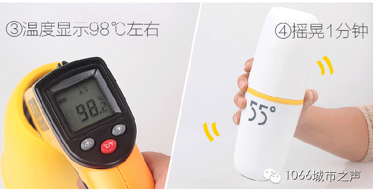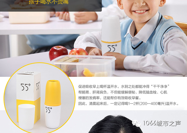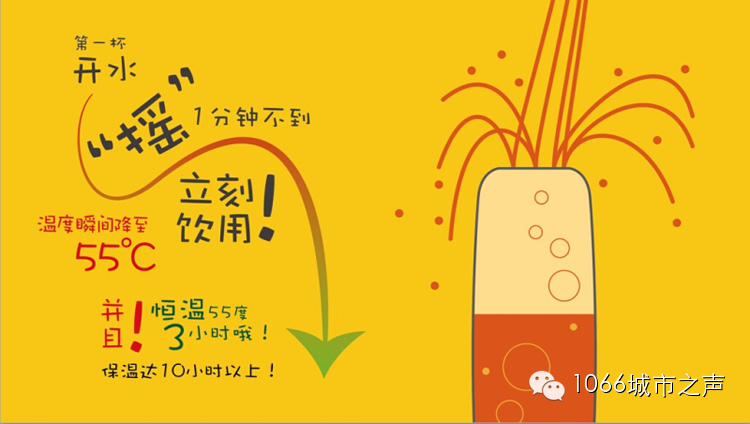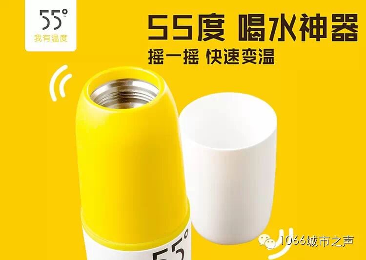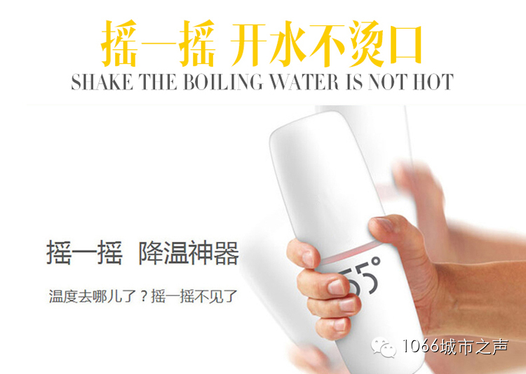喝水神器——55度杯!100攝氏度的開(kāi)水倒入杯中,搖一搖(約1分鐘),便可迅速降至55攝氏度左右的溫水,可立即飲用,并且可以恒溫3小時(shí);如果(第一杯)開(kāi)水喝完后,第二杯倒入涼水,搖一搖,可快速升溫至55攝氏度左右。搖一搖立刻能喝到舒適溫水!