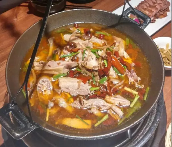 這鍋也不是普通鍋,必是生鐵的才好,一是厚重,鍋不會亂動,二是健康,補鐵補血,比廣告強。鍋內(nèi)放信陽老燉菜,老公雞、排骨、豬蹄、鵝塊,時間越久越有味。如果是冬天,“新醅酒,小火爐,天欲雪,一杯無”意境太贊,要是夏天,“炭火燒,大汗淌,赤膊上,可勁浪”,警察叔叔也管不著~~