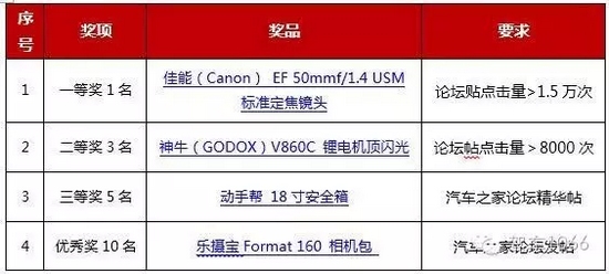 為了滿足眾多攝影愛(ài)好者和車(chē)迷們的拍攝需求,中原國(guó)際車(chē)展聯(lián)合攝影愛(ài)好者協(xié)會(huì)共同舉辦“中原國(guó)際車(chē)展汽車(chē)攝影大賽”。只要你愛(ài)車(chē)、喜歡拍照,就可以報(bào)名參賽!此外,在汽車(chē)之家發(fā)布論壇帖可以獲得大獎(jiǎng)喲~