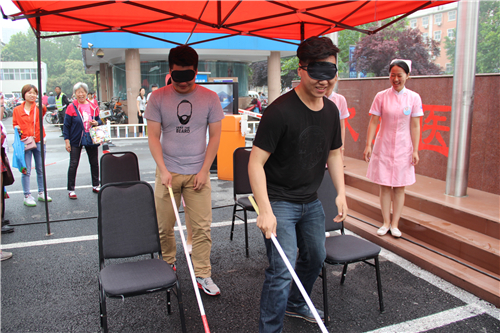 義診活動現(xiàn)場,還舉行盲人體驗(yàn)活動,邀請市民戴上眼罩模擬盲人參加各種游戲,以體驗(yàn)健康視力的寶貴。