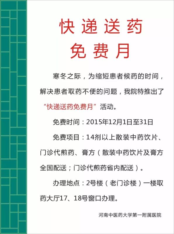 河南中醫(yī)學(xué)院第一附屬醫(yī)院藥學(xué)部—— 讓患者吃上道地好中藥即日起,該院推出“快遞送藥免費(fèi)月”惠民活動(dòng)。