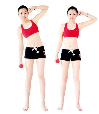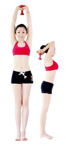 動(dòng)作要領(lǐng):雙臂盡量向上伸展,夾緊耳朵,身體拉直。大臂保持不動(dòng),小臂彎曲,盡量向下。然后,返回至初始位置。每組動(dòng)作重復(fù)20~50次,每回至少做4組,每組之間要有間隙。