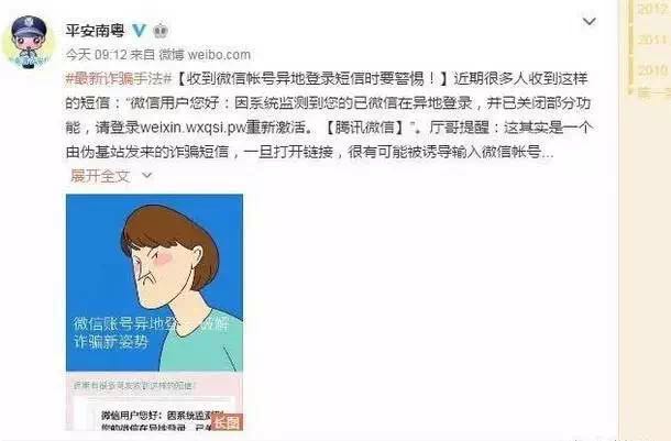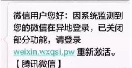 #最新詐騙手法#【收到微信帳號(hào)異地登錄短信時(shí)要警惕!】近期很多人收到這樣的短信:“微信用戶您好:因系統(tǒng)監(jiān)測(cè)到您的已微信在異地登錄,并已關(guān)閉部分功能,請(qǐng)登錄weixin.wxqsi.pw重新激活?!掘v訊微信】”。廳哥提醒:這其實(shí)是一個(gè)由偽基站發(fā)來的詐騙短信,一旦打開鏈接,很有可能被誘導(dǎo)輸入微信帳號(hào)、微信密碼、支付密碼、驗(yàn)證碼等,后果不堪設(shè)想……
