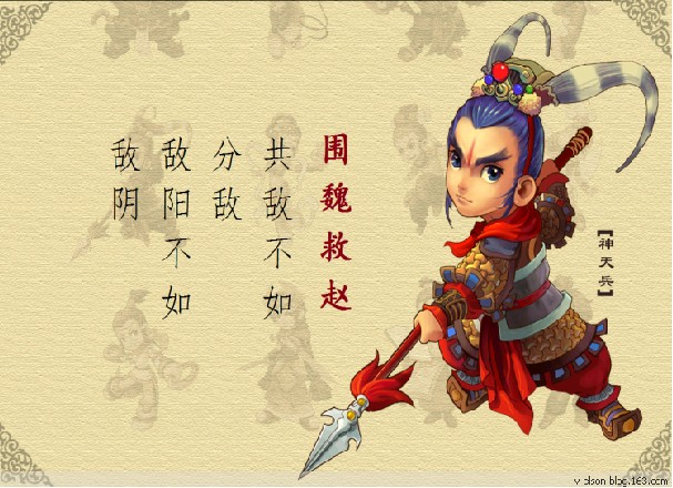 譯文:攻打兵力集中的敵人,不如設(shè)法使它分散兵力而后各個(gè)擊破;正面攻擊敵人,不如迂回攻擊其薄弱空虛的環(huán)節(jié)。本指圍攻魏國(guó)的都城以解救趙國(guó)。后指襲擊敵人后方的據(jù)點(diǎn)以迫使進(jìn)攻之?dāng)吵吠说膽?zhàn)術(shù)?,F(xiàn)借指用包超敵人的后方來(lái)迫使它撤兵的戰(zhàn)術(shù)。