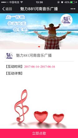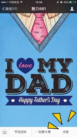 本周日就是父親節(jié)了。平時向爸爸們表達情意的機會可能不多,趁著節(jié)日,你可別落下。特意給親愛的老爸準(zhǔn)備了一份禮物,6月14日——6月16日,點擊菜單欄中的“點歌”或直接點擊本文底部的閱讀原文,進入點歌互動頁后點擊“立即點歌”,填寫并提交姓名、手機號、所點歌曲名稱、以及你想對父親說的話。