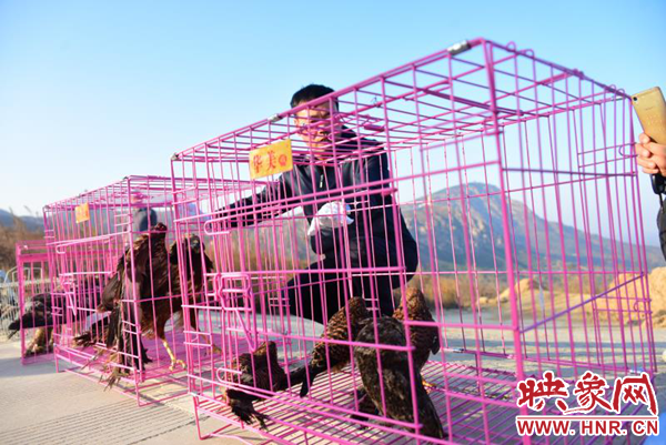 下午16時(shí)許,車(chē)隊(duì)到達(dá)了鄭市具茨山頂峰。16時(shí)10分,大家將鐵籠子一一卸下,擺放在路面上。