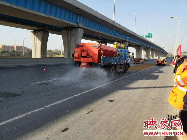 快速路的除雪保潔工作,趙勇總結為“一融、二鏟、三輥掃、四清運”。一融:氣溫在0度以下撒融雪劑。因為溫度低橋上路面會結冰,在橋上部分少量食用融雪劑,目的達到不結冰。二鏟:將不結冰的雪鏟到兩側。三輥掃:雪鏟滾刷清掃積雪。四清運:人機配合全面清除殘存冰雪。