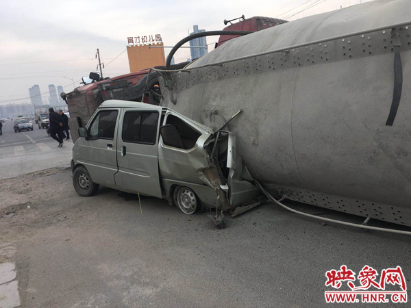 22日上午9時(shí)30分左右,江山路與新苑路交叉口東北角,車(chē)牌號(hào)為豫EX115掛的槽罐車(chē)仍然壓在車(chē)牌號(hào)豫AA817Y的面包車(chē)上。槽罐車(chē)上裝有40多噸散裝水泥,另一輛趕來(lái)救援的槽罐車(chē)正在將事故車(chē)內(nèi)的水泥轉(zhuǎn)移出來(lái)。救援的槽罐車(chē)司機(jī)說(shuō),事故發(fā)生時(shí),槽罐車(chē)沿江山路由南向北行駛,走到與新苑路交叉口時(shí),面包車(chē)沿江山路由北向東左拐。事故路口沒(méi)有紅綠燈,大車(chē)司機(jī)看到面包車(chē)后,立即向右打方向,躲避面包車(chē)。由于離心力作用,大車(chē)向左側(cè)翻,壓在面包車(chē)上,將面包車(chē)四分之三壓扁,僅剩駕駛室位置。