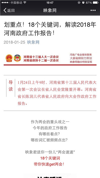 映象網(wǎng)官方微信策劃推出原創(chuàng)策劃《河南人,2018給你穩(wěn)穩(wěn)的幸福!》、《你好,我是河南!這是我的五年成績(jī)單,請(qǐng)接收!》、《2018年,河南都有哪些“小目標(biāo)”?》、《劃重點(diǎn)!18個(gè)關(guān)鍵詞,解讀2018年河南政府工作報(bào)告!》。每篇都刷屏朋友圈,網(wǎng)友積極轉(zhuǎn)發(fā)點(diǎn)贊,稱“看完真的覺(jué)著穩(wěn)穩(wěn)的幸?!?。
