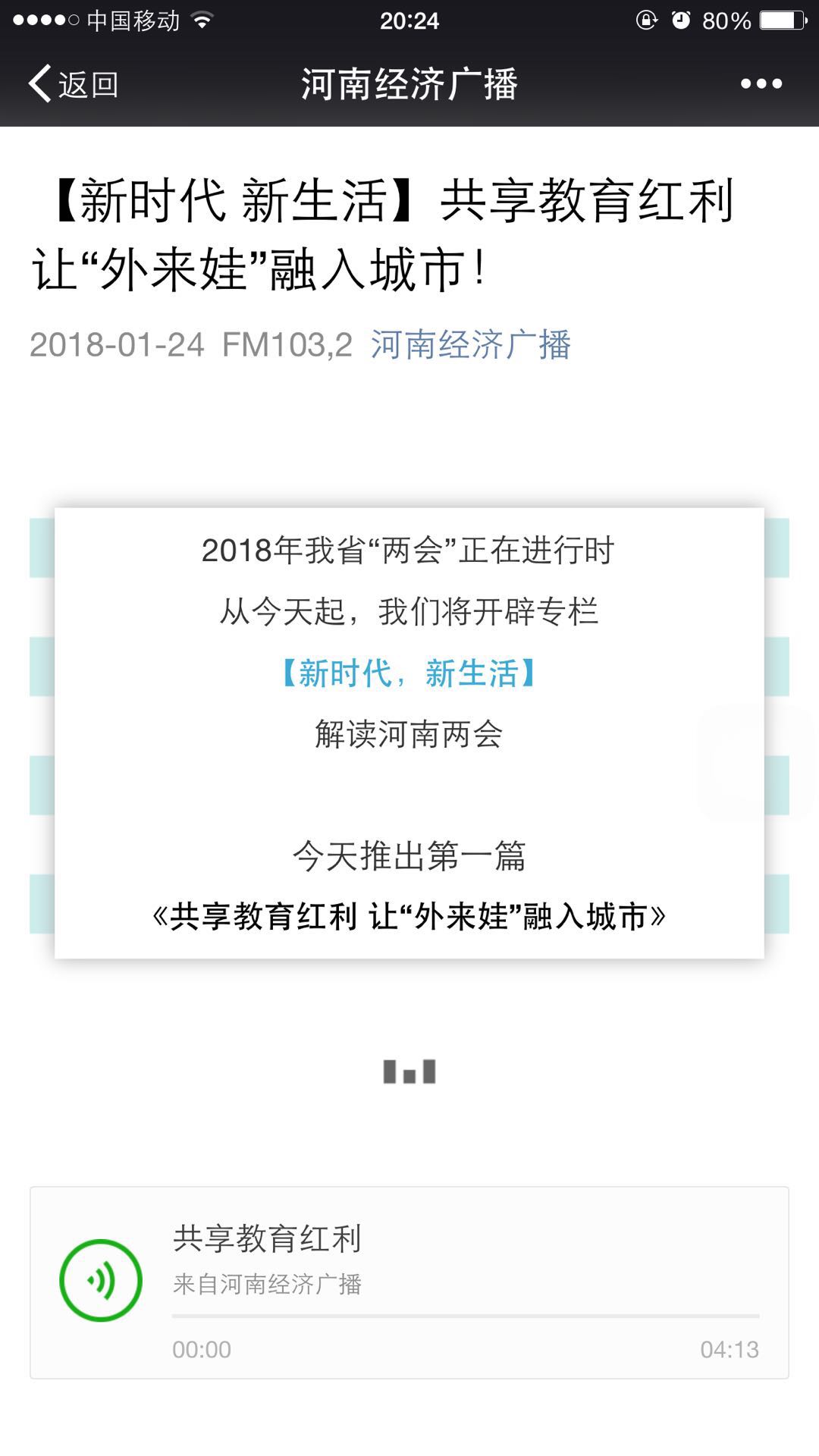 河南經(jīng)濟(jì)廣播推出兩會(huì)專欄“新時(shí)代 新生活”,推出五篇深度報(bào)道:《共享教育紅利 讓“外來(lái)娃”融入城市!》、《藍(lán)天白云下的大數(shù)據(jù)“護(hù)衛(wèi)隊(duì)”!》、《讓家庭醫(yī)生打通分級(jí)診療“最后一公里”》、《加大住房保障力度,圓百姓安居夢(mèng)!》、《扎根中原大地,“創(chuàng)”出美好未來(lái)!》,總時(shí)長(zhǎng)25分鐘。這一組報(bào)道用“講故事說(shuō)新聞”的方式,關(guān)注隨遷子女享有與城市學(xué)生一樣的高品質(zhì)教育、環(huán)保技術(shù)革新、返鄉(xiāng)下鄉(xiāng)創(chuàng)業(yè)扶貧、保障房建設(shè)、生態(tài)文明等熱點(diǎn)民生話題,每期采訪都做到聲音全面、數(shù)據(jù)詳實(shí)、人物典型、立意深遠(yuǎn),通過(guò)對(duì)代表、委員建議、對(duì)話部門、基層聲音等四個(gè)方面,對(duì)熱點(diǎn)話題報(bào)道做到有“廣度 高度 深度 溫度”。
