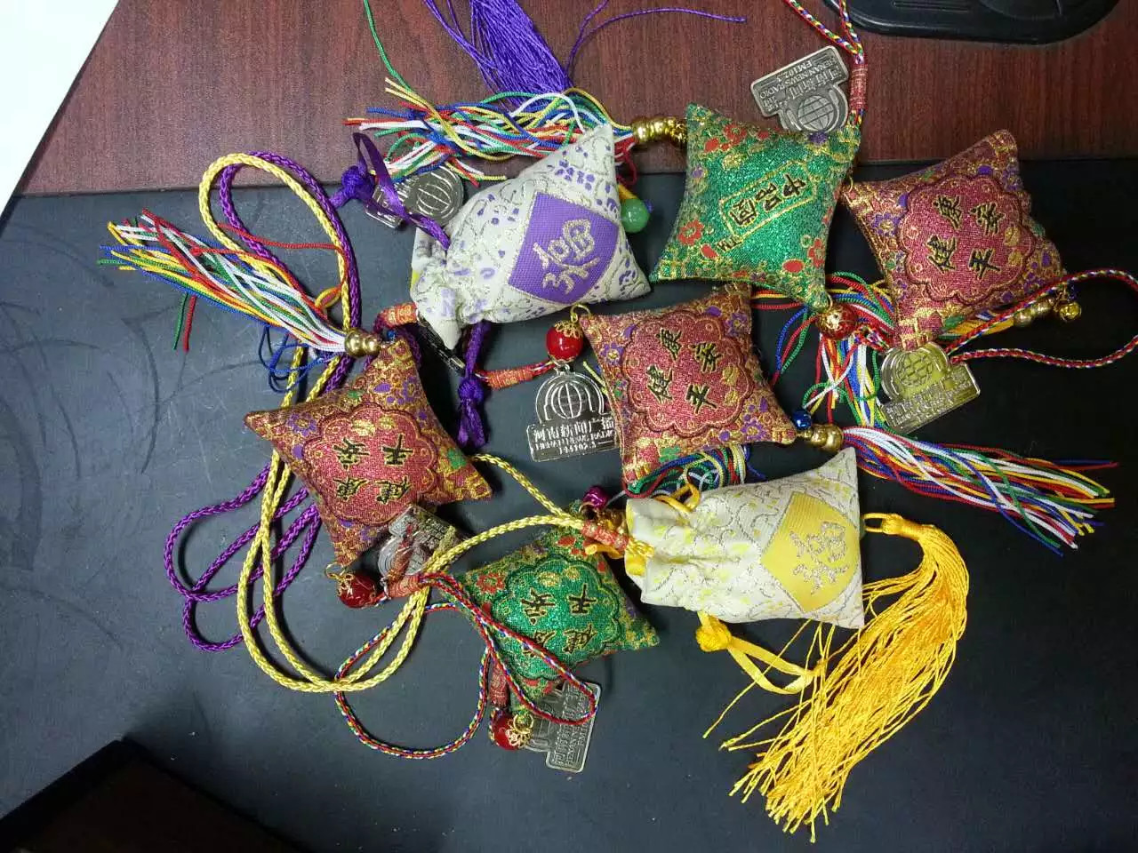 端午節(jié)佩香囊,不但有避邪驅(qū)瘟之意,而且有襟頭點綴之風(fēng)。香囊內(nèi)有朱砂、雄黃、香藥,外包以絲布,清香四溢,再以五色絲線弦扣成索,作各種不同形狀,結(jié)成一串。