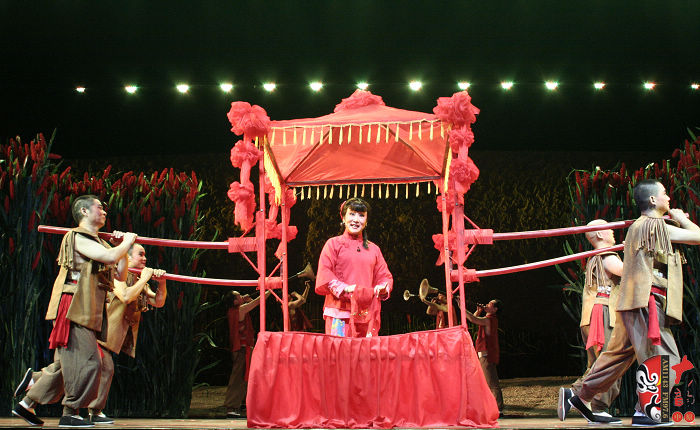 本劇以蓬蓬勃勃、充滿野性、有著旺盛生命力的紅高粱為意像,以九兒和十八刀的愛恨情仇為主線,描繪了上個(gè)世紀(jì)三、四十年代,先民們敢愛、敢恨、敢生、敢死的自由精神與生命氣度以及他們對(duì)入侵者不惜用鮮血和生命抗?fàn)?、可歌可泣而又悲壯慘烈的過程。最后九兒用高粱酒做炸藥,引爆了日本人的軍火車,軍火車的爆炸又扎爆了熟透了的高粱米,滿天都飄灑著絢麗的高粱花——這是他們的鮮血之花、靈魂之葩,更是他們精神的升華。