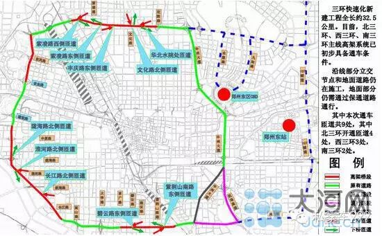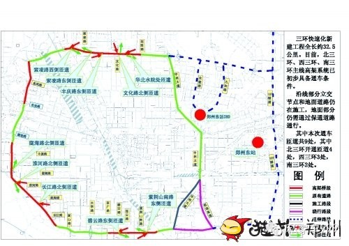 北三環(huán)中州大道立交橋,東西向雙線通車、由西向南通車、由南向西通車,其他方向因正施工無法通車。地面道路僅南陽路立交橋下部分匝道、花園路4條輔道擴(kuò)寬段部分因管線遷改影響不具備通車條件,中州大道立交橋下南北方向通車?!?/p>